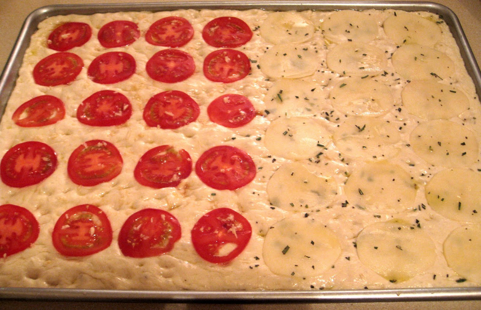 - I decided to make half of my focaccia with tomato, basil, and garlic and the other half with potatoes, rosemary, and garlic. Spread the minced garlic over the entire surface of the dough. Then on one half, arrange the tomato slices over the top. On the other half, sprinkle on some rosemary, then arrange the potato slices over the top. Sprinkle some more rosemary on top.